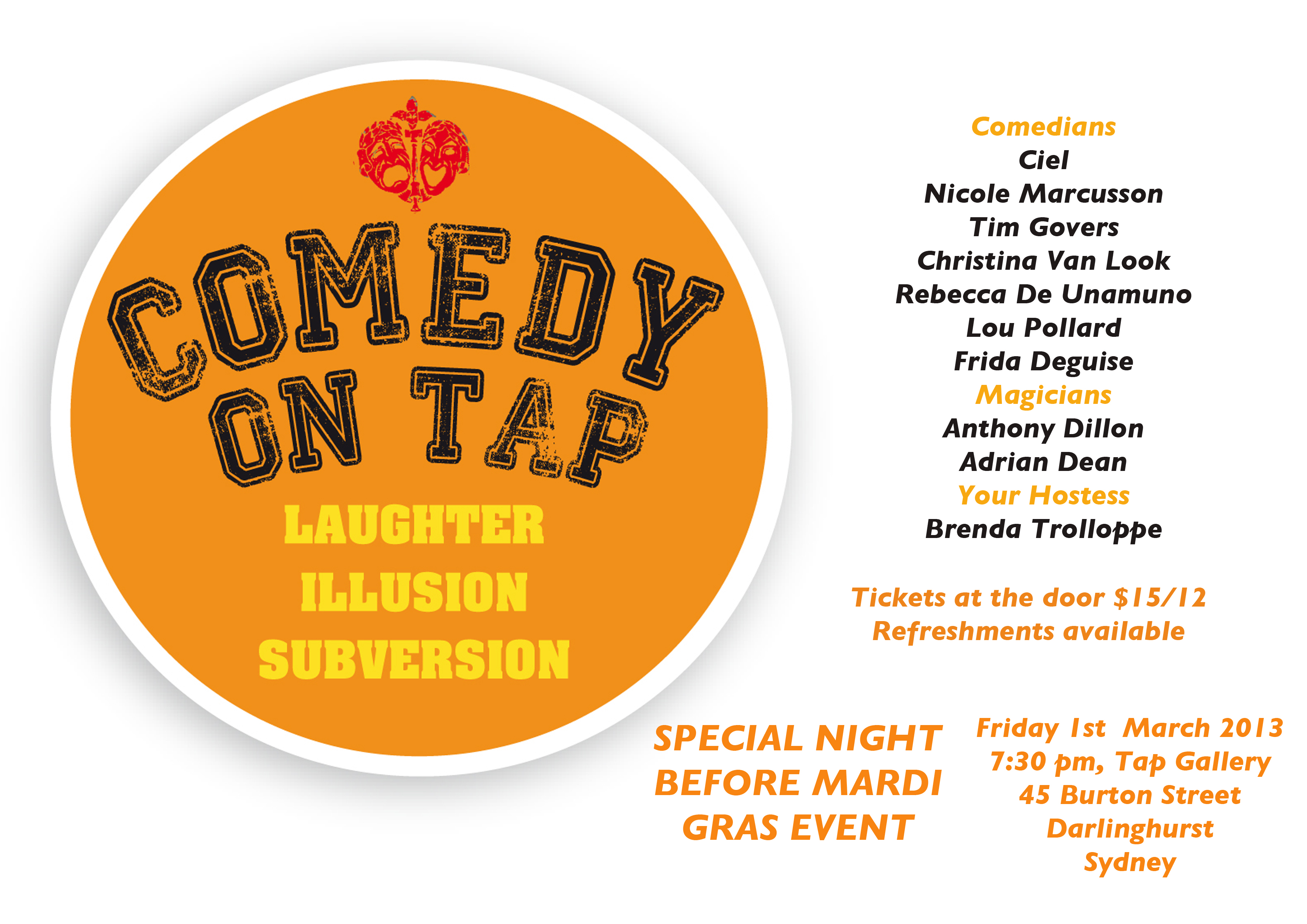 Posted: March 1, 2013 Filed under: ART, COMEDY, FEMINISM | Tags: Australian stand up comedy, Brenda Trolloppe, Ciel Comedian, Comedy On Tap, Comedy On Tap Stand up comedy night, Fabulous female artists, female comedians, female painters, Lou Pollard comedian, Tap Gallery 2 CommentsI started doing stand up comedy 15 years ago, back when I only had one children. I supported Arj Barker, went to the Melbourne International Comedy Festival, had loads of fun and got away with perving at a lot of good looking men from the stage. Then I embarked on a more extensive breeding program so I gave up stand up for a few years because I was so sleep deprived nothing was funny. Back when I was performing comedy regularly, a fabulous, strong, feminist lady artist called Pam constantly baby sat for me and ensured that my daughter had a magical time at Pam’s house drawing and painting and visiting art galleries. My teenaged daughter is now an artist because of the love and care and help Pam gave her when she was very small. I’m back doing stand up and I’m putting on a comedy night once a month with good friends at a gallery in Sydney. Pam died this week in a terrible accident and our first comedy night is the night before her funeral. I don’t know how I’m going to be funny in the face of losing my friend. I’ll be looking out into the audience and hoping she’ll be there because she really helped me to follow my dream. Thank you Pammy.